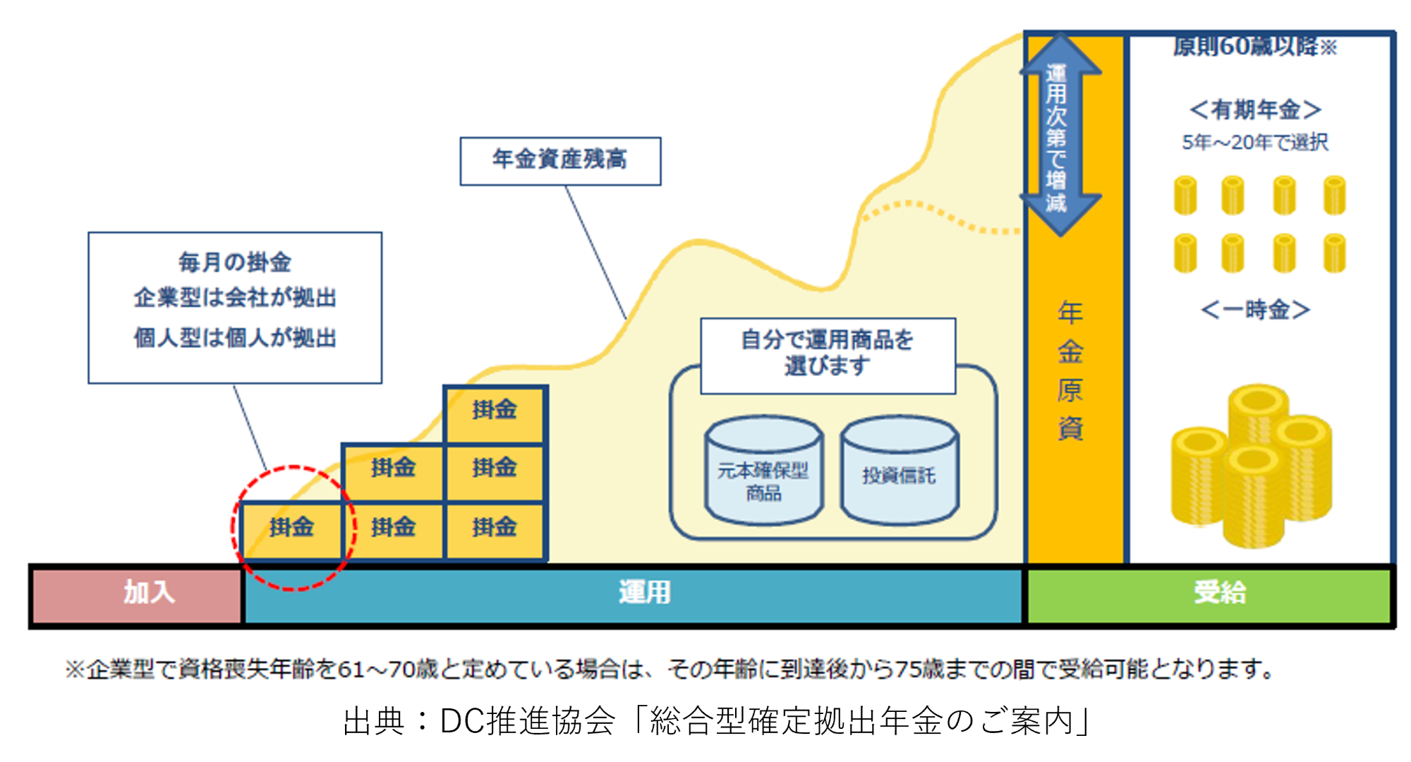 また、受け取る際は原則60歳以降※75歳までの間で選ぶことができます。